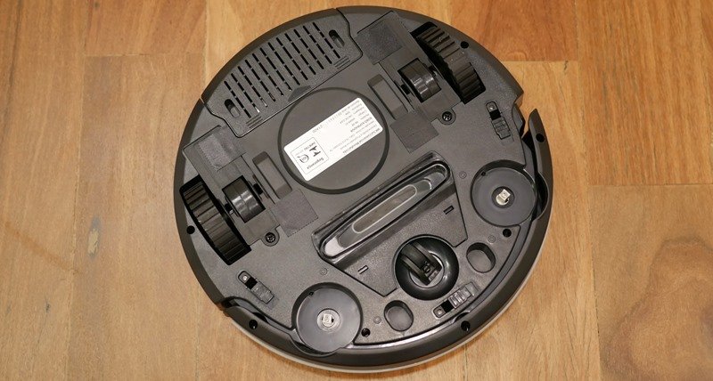 Na face inferior o robô possui um conjunto com 3 rodinhas emborrachadas, além das 2 cerdas giratórias que servem para direcionar a sujeira para o bocal de sucção que se encontra no centro do produto.