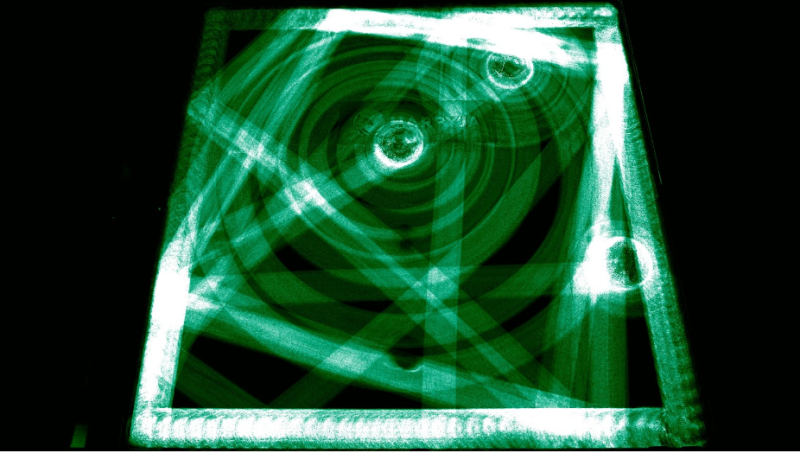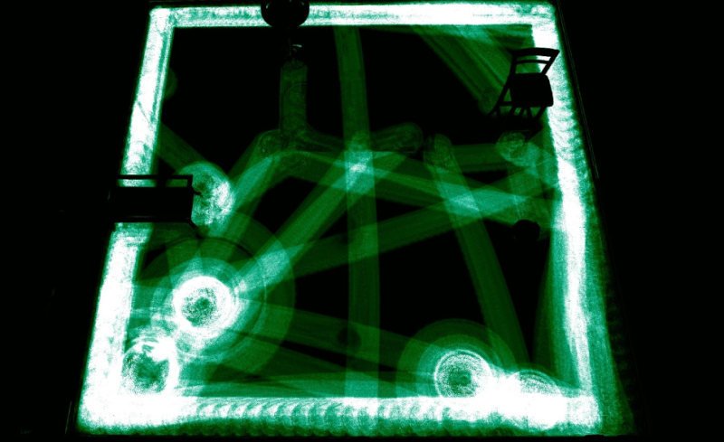 A foto acima mostra o trajeto do aspirador Mondial Fast Clean funcionando por um período de 30 minutos em um ambiente sem obstáculos. A foto abaixo mostra o funcionamento durante o mesmo período no mesmo ambiente com alguns obstáculos colocados no caminho.