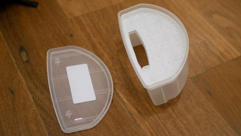 Abrindo a tampa superior fica o reservatório de poeira. É um conjunto de peças transparentes em plástico mole, translúcido, e internamente fica o filtro de pano lavável. É uma peça de malha fina, mas não possui filtro HEPA como alguns filtros do mercado.