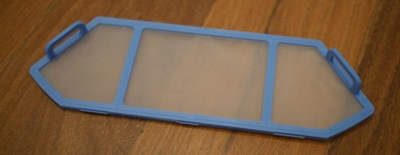 O reservatório de poeira possui 3 filtros diferentes para que a poeira coletada não seja jogada novamente para o ambiente e nem acabe se acumulando dentro do produto. O primeiro é o mais grosso, feito de uma malha fina plástica. O segundo, é uma espécie de espuma para segurar resíduos um pouco mais finos, e por último um filtro HEPA para coletar até as menores partículas.