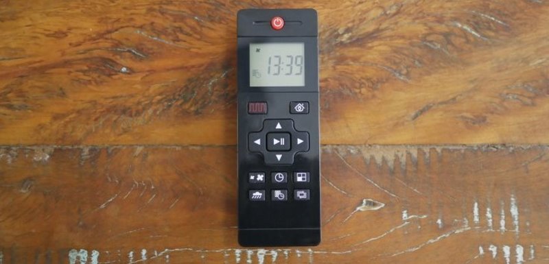 O robô acompanha também um controle remoto simples porém funcional, o controle possui alguns botões com as principais funções do produto e um pequeno display na qual ele mostra o horário e a função que está sendo utilizada.