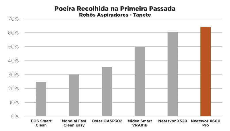 Como esperado, em cima do tapete o aspirador se saiu melhor com poeira mais grossa (areia, terra) e partículas pequenas (como arroz). Foram coletados 83% de poeira grossa e 95% de partículas pequenas. Nessas situações, não houve melhora significativa ao aspirar novamente.