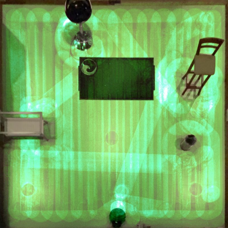Diferente de muitas opções no mercado, o X600 Pro não possui rotinas diferentes de limpeza. Na verdade seu comportamento é quase sempre o mesmo independente da situação. O aspirador geralmente inicia com uma rápida limpeza de cantos, e parte para uma movimentação zig-zag, cobrindo o miolo da sala. Confira o caminho percorrido abaixo, indicado em verde.