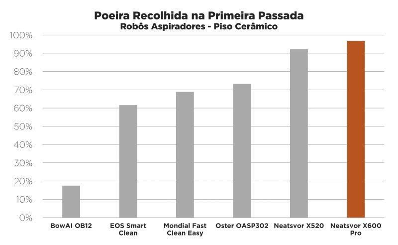 Por conta da cobertura de boa qualidade, este Neatsvor conseguiu atingir altos resultados em pisos rígidos como cerâmica. De poeira fina (como pó) a partículas grandes (como ração) a coleta foi altíssima, acima de 95% em qualquer situação. Os melhores resultados foram com poeira grossa (como areia, terra) e partículas grandes. O que sobrou estava posicionado bem nos cantos.