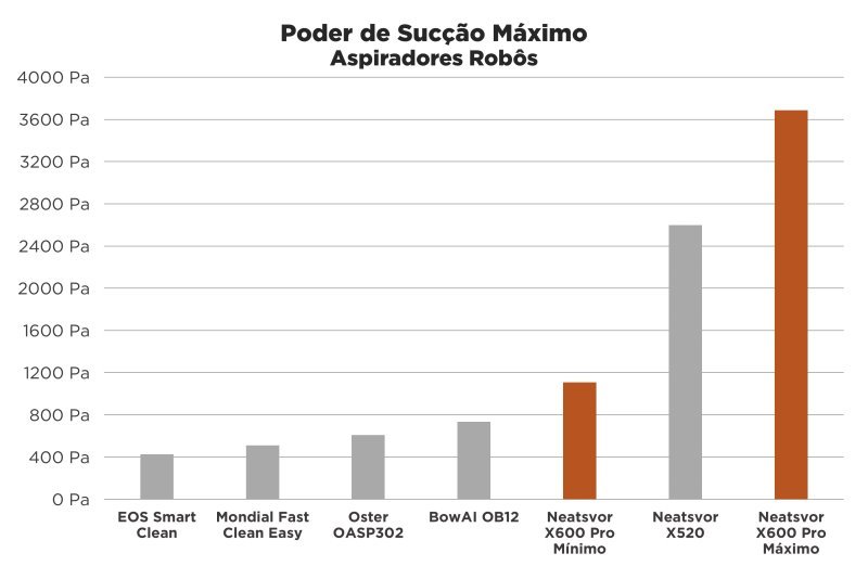 Na força máxima o robô entrega próximo de 3700 Pa, valor bem superior até mesmo ao X520. Mesmo na força mínima, seus 1100 Pascal são mais que o dobro da maioria dos outros robôs aspiradores.