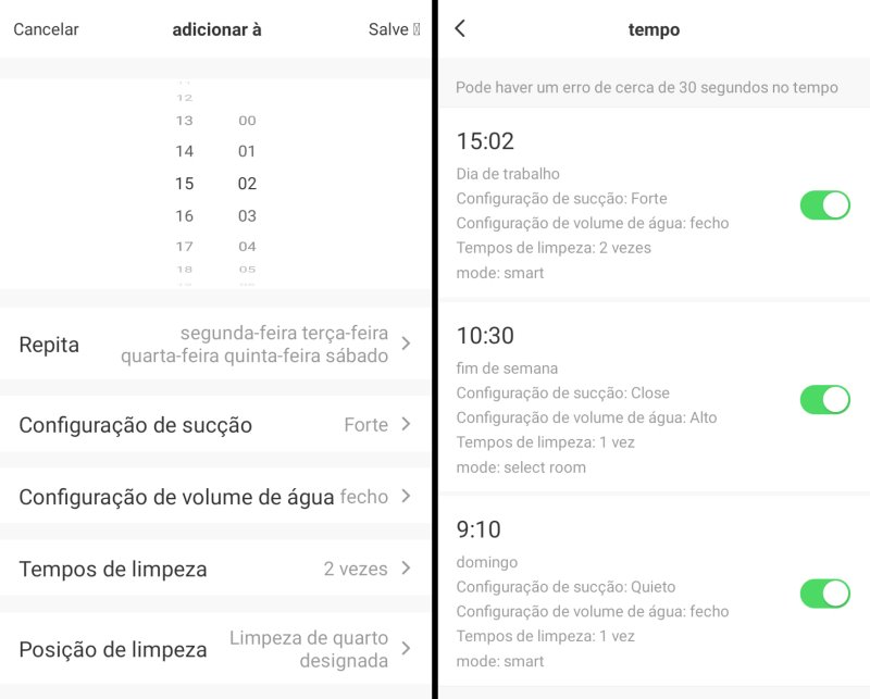 Assim como o alarme do celular, através da opção “Tempo” é possível definir os dias da semana, horário e outras informações para a limpeza da sua casa. Programe o robô para limpar cômodos específicos ou a casa toda.