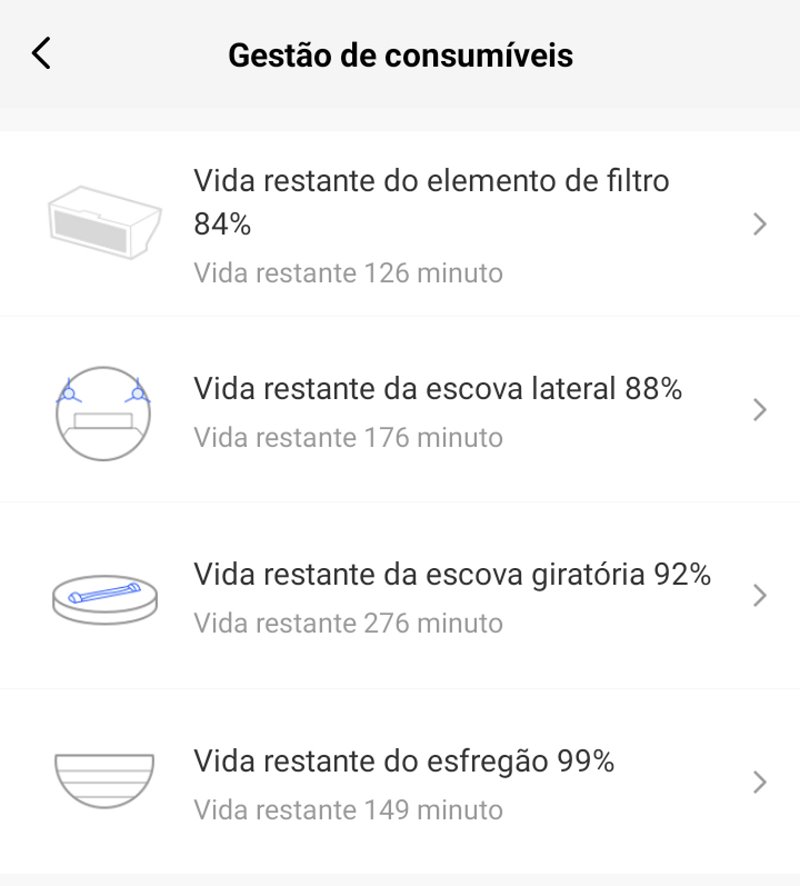 A função é simples mas incrivelmente útil. Aqui você pode acompanhar a vida restante estimada para cada peça que um dia virá a ser trocada. As informações são atualizadas de acordo com o uso do aspirador e ao tocar nas opções você pode reiniciar o timer de cada.
