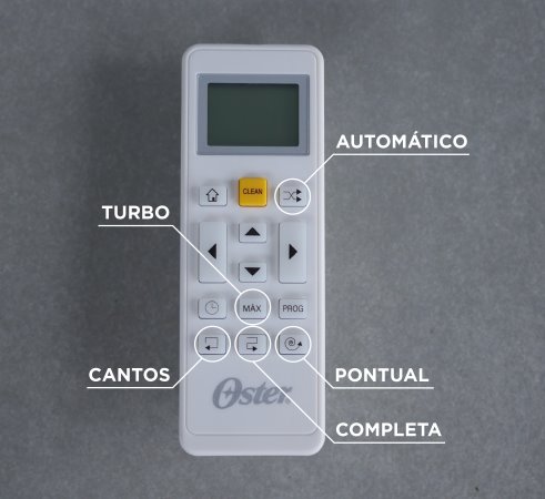 Mais funções estão disponíveis no controle, como enviá-lo para a base. Nesse caso é preciso que a base esteja no mesmo cômodo e (segundo a Oster) até 4 metros de distância. Essa distância pode ser diminuída se houver obstáculos que a escondam do robô, nesse caso ele fica girando tentando encontrar sua base e parte em alguma direção aleatória para continuar a busca e voltar a girar.