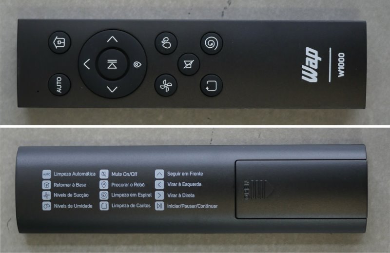 A WAP também inclui um controle remoto. Todas as funções do controle existem no aplicativo, faltando apenas algumas como Agendamento de Limpeza. As pilhas estão inclusas e é interessante que nas costas do controle está uma descrição de cada botão.