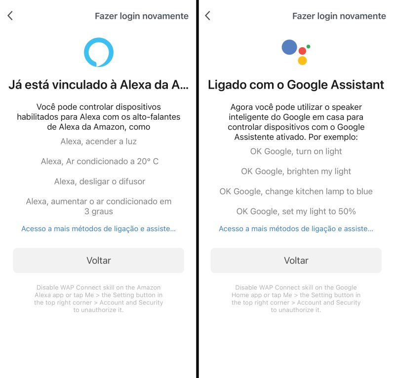 É possível realizar a conexão com Alexa e Google Home para controlar o robô aspirador com voz. O processo é simples, buscando a skill WAP Connect no aplicativo do assistente e permitindo a integração.