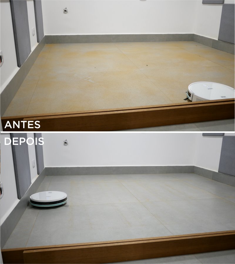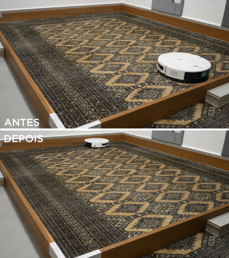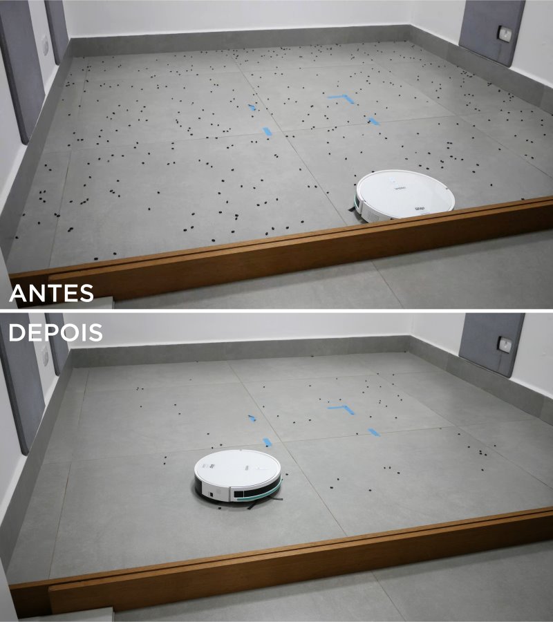 Isso possibilita atingir coletas melhores em carpetes e tapetes. Pelo observado, podemos afirmar que o robô consegue limpar poeira e partículas que não ficam tão embrenhadas nas fibras do tapete.