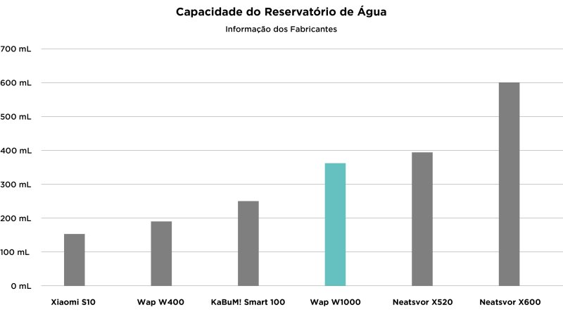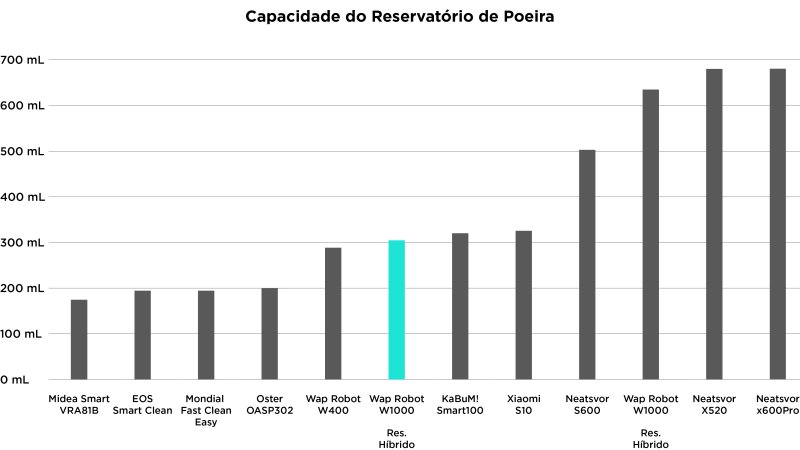 Tanto o tamanho da abertura quanto do reservatório foram reduzidos, o reservatório duplo do Wap W1000 possui 305 mL de capacidade para poeira. É um volume baixo, será capaz duas ou três limpezas antes de precisar esvaziar. O reservatório simples conta com 635 mL, suficiente para uma semana ou mais sem limpeza.
