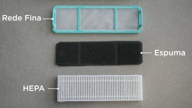 O conjunto de filtros está dentro do oferecido pela maioria dos aspiradores robôs de nível mais alto. Em ambos os reservatórios o conjunto é triplo, e de qualidade alta de filtragem: