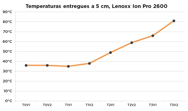 Por outro lado, enquanto a temperatura entregue pela maioria dos secadores cai bastante com o distanciamento da cabeça, a do Lenoxx Ion Pro se mantém praticamente a mesma, fato que não pode ser dito de nenhum outro testado até agora.