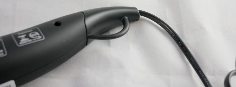Na base da empunhadura, há um gancho para os que desejam deixá-lo pendurado. É de boa qualidade, e com certeza aguenta bem mais que o peso do produto (540g se considerarmos o cabo de alimentação com 167 cm).