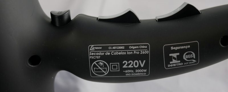 Na empunhadura há material escrito para apresentar informações básicas como a tensão do produto e prevenir sobre o uso com água. A impressão é boa, com um leve erro, e agrada ter estas características sempre à mão.