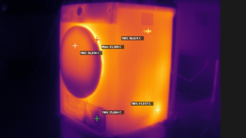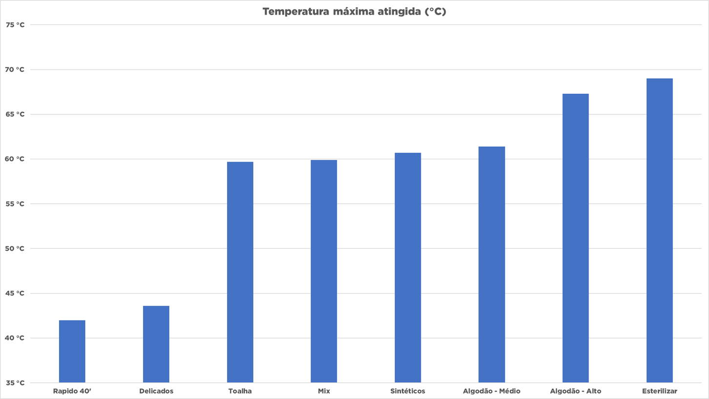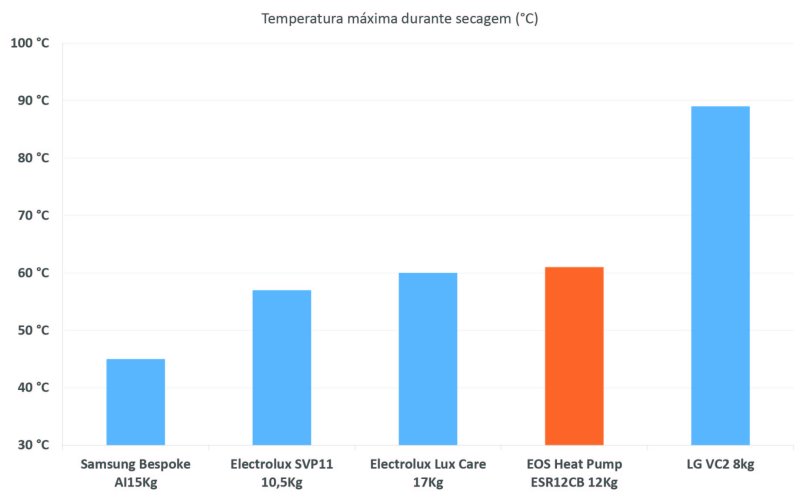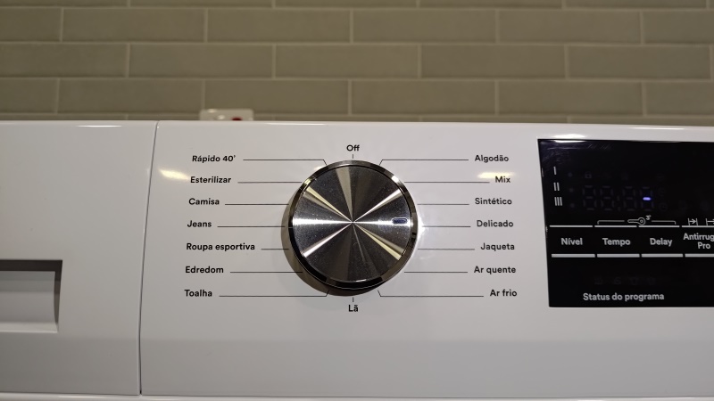 Por sinal, já que entramos no assunto de temperaturas, a maioria dos programas atinge em torno de 60°C quando concluindo o ciclo. Similar a várias secadoras convencionais do mercado. No geral, o que determina a temperatura máxima interna é o tempo de ciclo, pois o processo de aquecimento é lento e assim ciclos curtos como “Delicados” atingem temperaturas abaixo de 50°C.