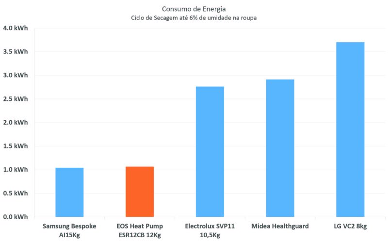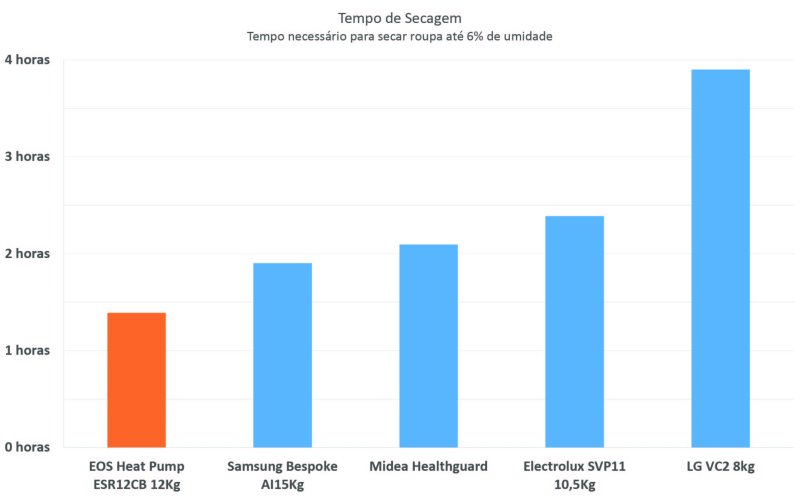 Comparando essa secadora bomba de calor EOS com a Samsung e alguns modelos convencionais do mercado (“vented”) a EOS se destaca, sendo a mais rápida entre elas.