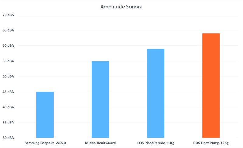 Quando se tratando de ruído a unidade poderia ser mais silenciosa. Ficou acima de secadoras vented do mercado e absurdamente mais barulhenta que a Samsung Bespoke AI. Vale deixar essa EOS na lavanderia com a porta fechada.