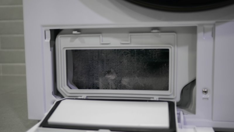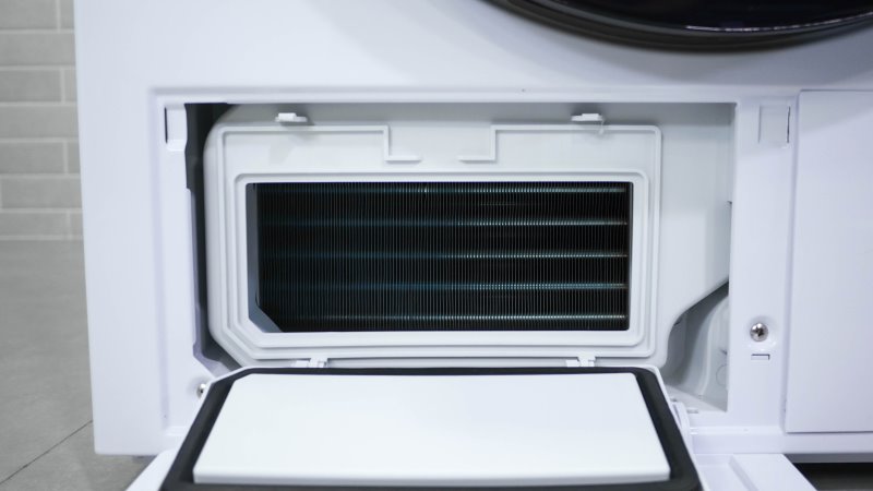 Em secadoras bomba de calor, o ar quente passa por uma grade metálica fina que precisa ficar ausente de fiapos. Ou seja, o filtro tem um papel muito importante para garantir a limpeza das serpentinas.