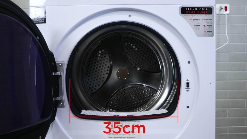 A boca da porta é grande, com 35 centímetros de largura. Se torna muito mais prático adicionar e remover roupas dessa secadora EOS em relação à modelos da Midea ou Electrolux com aberturas 5 a 6 centímetros menores.