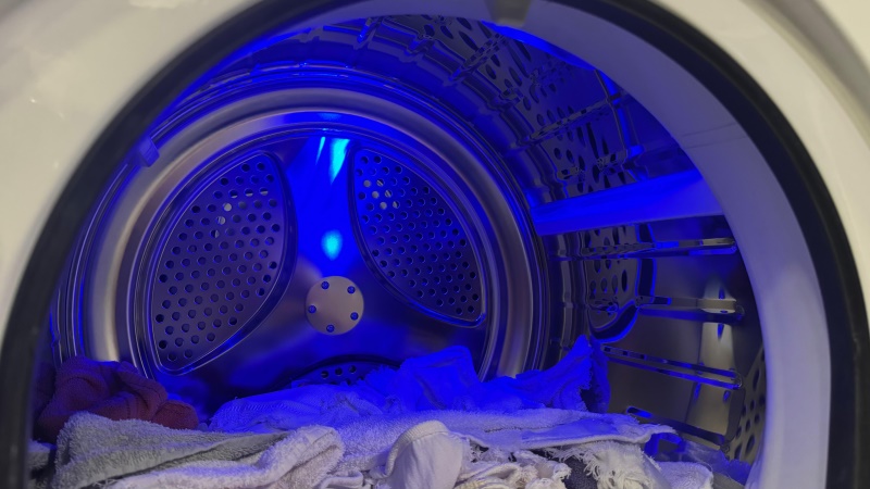 Agradou a luz violeta visível, pois ela dá um charme quando abrindo a porta ou iniciando um ciclo. Na questão da esterilização, pode ser que a LUZ UV-C esterilize, porém dentro do que já estudamos sobre o assunto, a efetividade de um LED para cobrir o espaço da secadora será pouco significativa. Nesses casos vale mais usar o programa “Esterilizar” que chega a bater quase 70°C dentro da máquina.