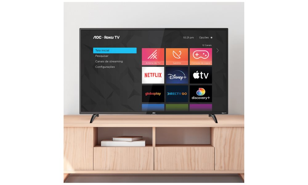 A SMART TV FULL HD AOC ROKU TV é apresntada nos tamanhos 32, 39, 43 e 50 polegadas, o modelo desta descrição é o 43 polegadas