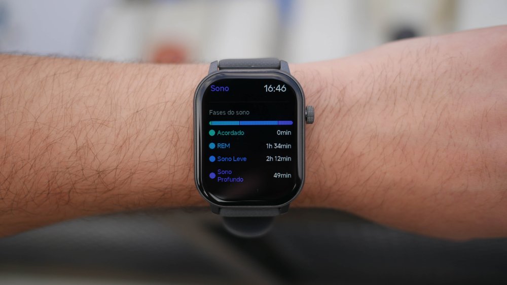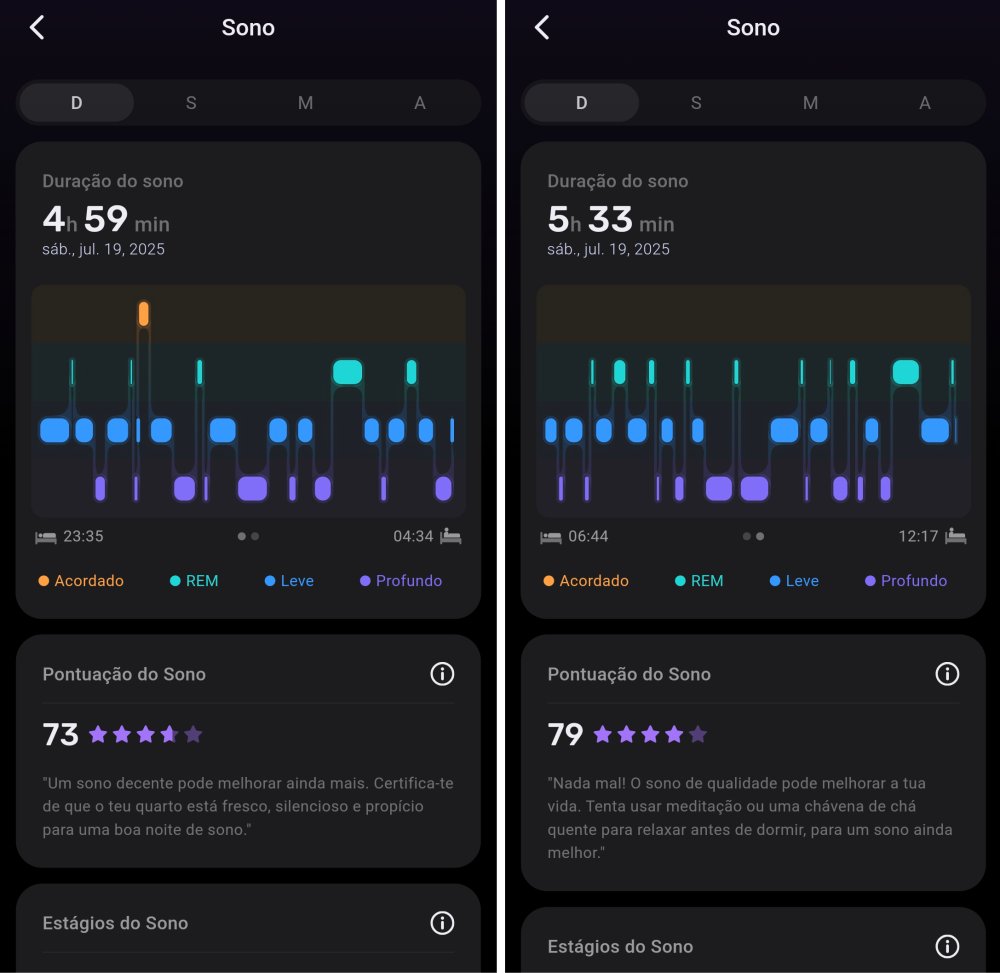 Se você levantar no meio da noite, porém, o relógio para de contabilizar aquele sono. Ele volta a contar quando dormir novamente, mas como 2 “sessões de sono” separadas.