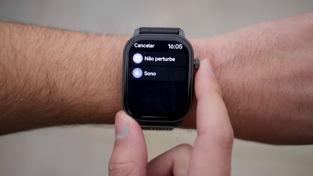 Uma configuração que facilita na hora de dormir é o modo Sono, localizado ao lado do Não Perturbe. Neste modo, além da falta de alertas e vibração, o relógio só acende com a coroa pressionada e mesmo assim com brilho reduzido. A opção simples resume todas as mudanças necessárias para não atrapalhar o descanso.