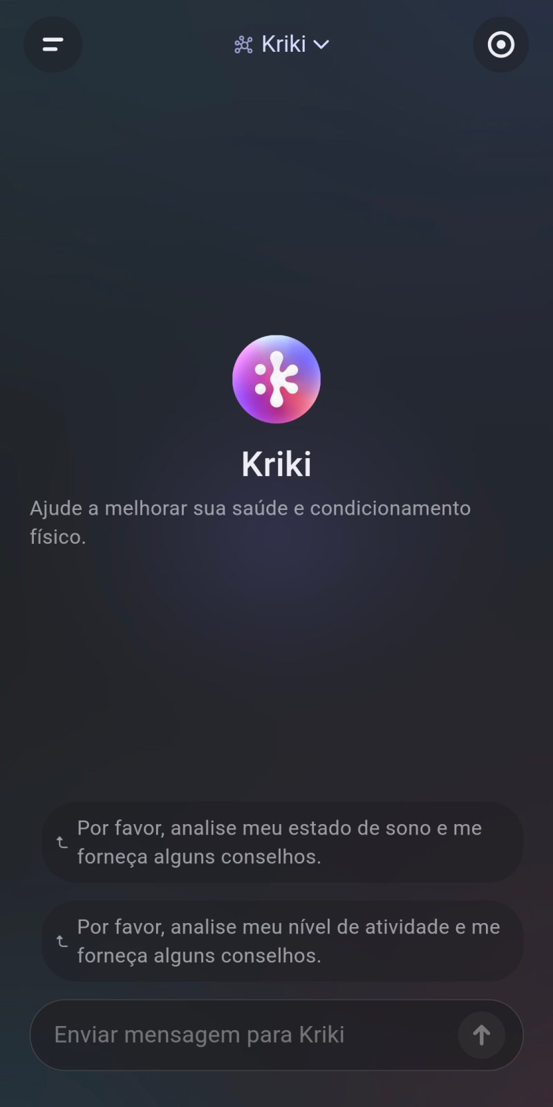 Ainda há uma aba inteira dedicada a uma Inteligência Artificial chamada Kriki. Seu propósito fica bem incerto, ainda mais trazendo a ideia de tirar “insights e sugestões para melhorar sua saúde e bem-estar”. Parece apenas uma adição feita para surfar na onda de IAs como ChatGPT, sem benefício ou intenção definida.