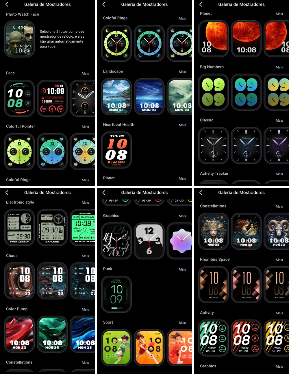 A galeria de mostradores padrões do aplicativo representa uma pequena variedade para o smartwatch Zeblaze. Provavelmente encontrará algum que o agrade, pois os designs são distintos entre si. Algumas watch faces mostram indicadores na tela, não apenas o horário. É possível deixar alguns salvos no relógio, para você poder mudar quando desejar sem uso do aplicativo.