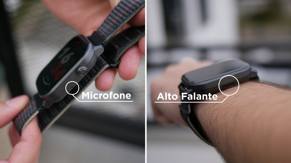 Com este tamanho, o relógio consegue uma tela touch de 2 polegadas, além de um microfone discreto ao lado da coroa e um alto falante do lado oposto.