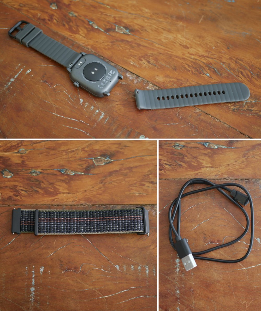 Junto ao relógio, vem o cabo para carregar e duas pulseiras: