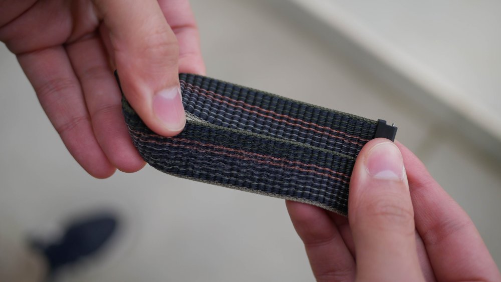 A pulseira de nylon é bem confortável, e traz uma estética mais característica. O velcro se adere diretamente na própria pulseira, então ao longo do tempo a região de que é usada fica um tanto gasta.