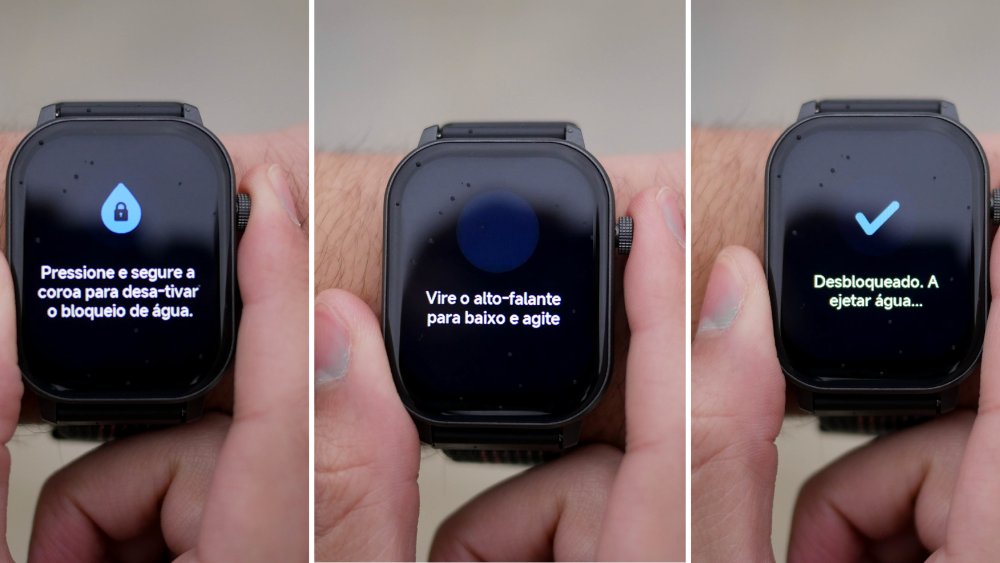 Se for mexer com água, até há uma função que pode ajudar. O Bloqueio de Água desliga a sensibilidade ao toque da tela, e ao desativá-la (segurando a coroa) emite um zumbido para expulsar qualquer gota que tenha se alojado no alto-falante.