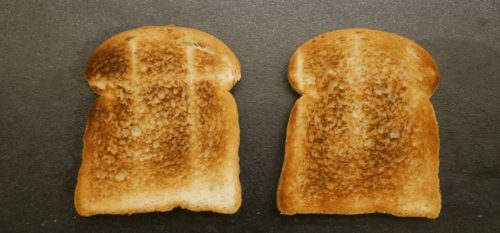 Com o auxílio da grade que centra o pão para tostar, a Britânia Large Toast torra o pão de forma homogênea. Os dois lados do pão saem praticamente com o mesmo grau de tostagem e o pão torra de ponta a ponta, por completo. Único porém é que essa tostagem é lenta, secando o pão mais do que desejado no processo. Se o produto possuísse um pouco mais de potência poderia garantir que o centro ficasse macio ao mesmo tempo de entregar uma superfície crocante. Neste caso é melhor tostar pouco as torradas nela para ter um resultado melhor. Vale ressaltar que em um dos lados desta torradeira o pão não torrou bem na base. Na foto de um dos testes isto é evidente.