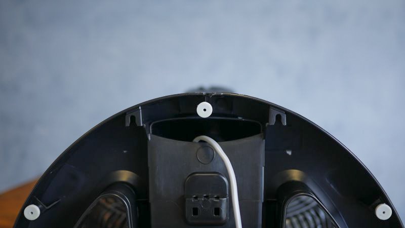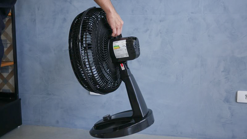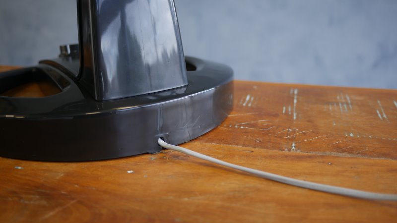 Possui uma espécie de porta-fio, onde pode-se inserir o cabo para dentro da base do ventilador e prendendo a tomada no local da base.