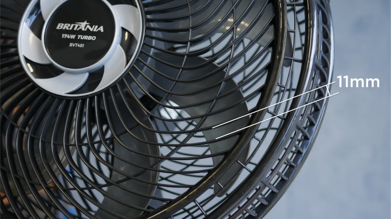 Porém na lateral da grade, que também possui espaçamentos deste tamanho, pode-se alcançar com esforço a hélice do produto. Por ser menor em diâmetro comparado a outros modelos, essa distância entre grade e hélice faz a diferença.