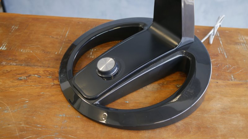 O ventilador se destaca pela sua base com espaços ao meio, diferente do que normalmente se vê em outros produtos onde toda a base é coberta. A base é preta e toda plástica, com a parte central fosca, gerando um contraste com o entorno brilhante.