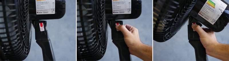 Esse ventilador da Britânia cobre um total 70° de oscilação na horizontal, sendo 33° para a direita e 37° para a esquerda. Quase simétrico, há ventiladores que oscilam bem mais para um lado do que para o outro. Para acionar a oscilação, empurre o pino posicionado no motor.