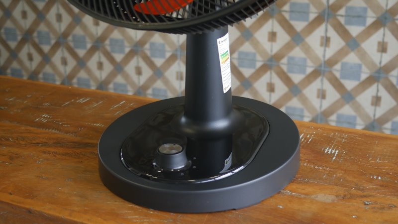Um cabo que chega para fazer a alimentação até o motor fica exposto. Esta é uma forma fácil de garantir que ele não interfira com a oscilação vertical, porém quando usado como ventilador de mesa, uma boa parcela fica exposta. A cor diferente do resto do corpo acaba por destacar a área e prejudica a estética.