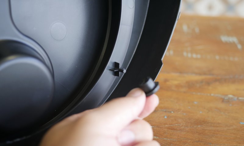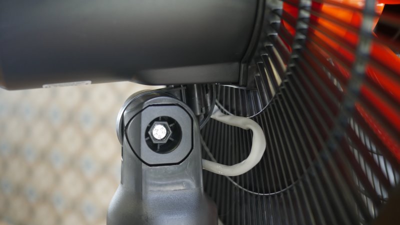 Um pino no invólucro do motor ativa a oscilação lateral, o sistema é comum em ventiladores e aqui não é diferente. Empurrar o pino é bem leve, mas em alguns pontos da rotação ele teima um pouco a levantar.