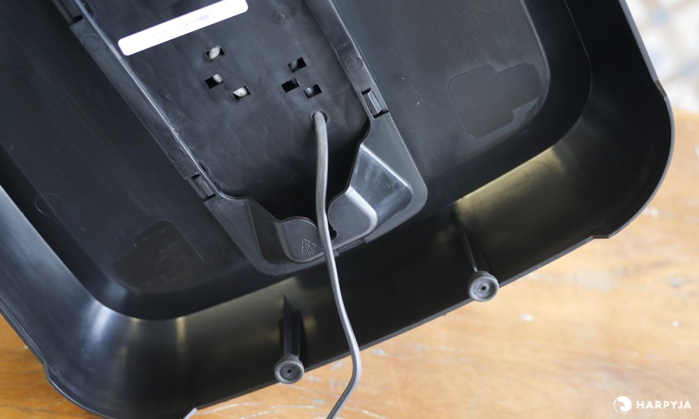 O cabo de alimentação sai quase do centro do produto, com o lado mais próximo sendo a parte de trás. A partir deste ponto são 116 cm de extensão. Infelizmente não há espaço para guardar ou enrolar o cabo.