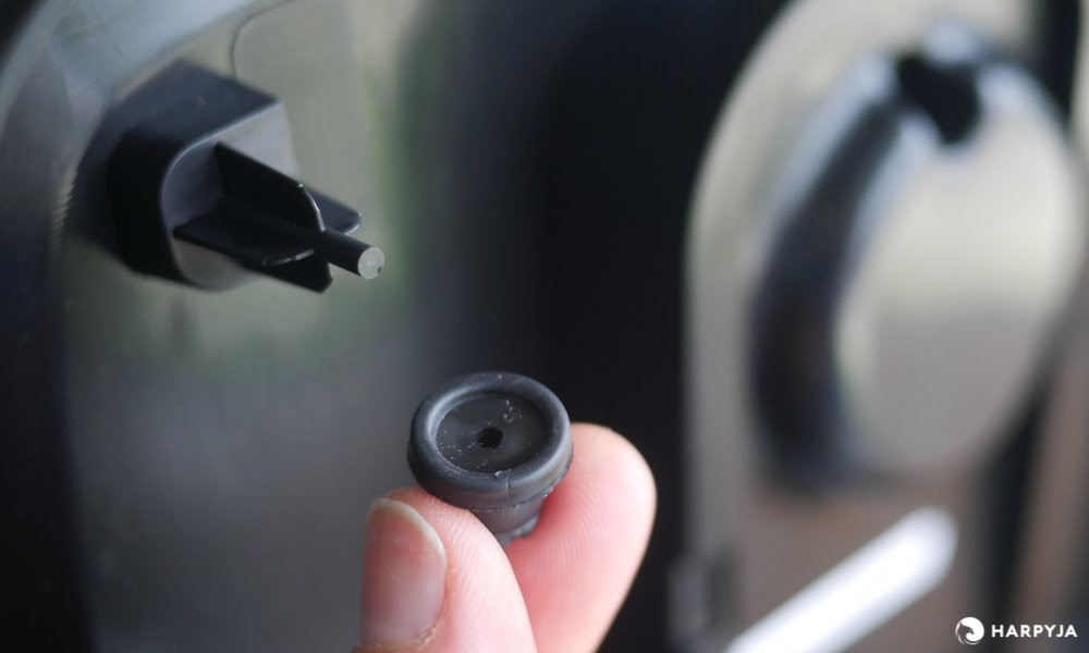 Para prender e desprender a grade, há 4 presilhas nas laterais da grade. Um ponto positivo é que são largas e fáceis de utilizar. Algumas presilhas similares da Arno, por exemplo, são mais estreitas. A área maior realmente facilita no encaixe e desencaixe. A hélice fica bem centrada e não oscila quando girando.