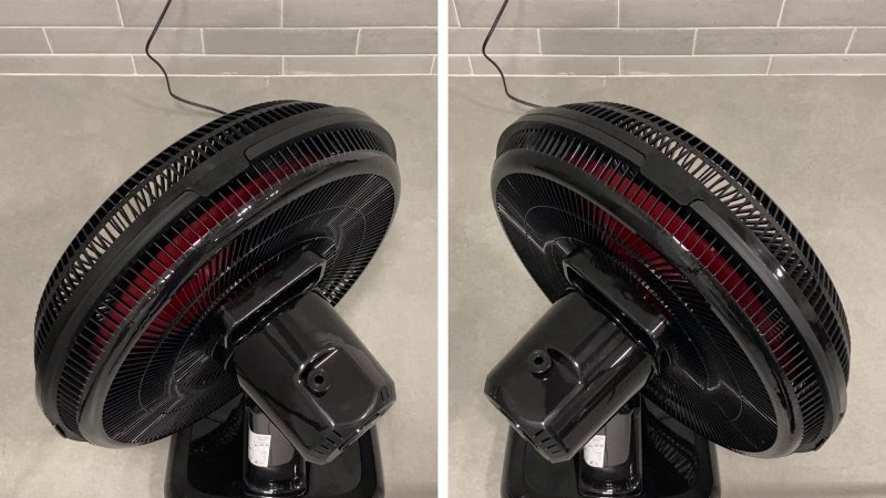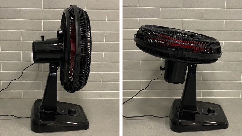 Um pino no motor aciona a oscilação lateral. Pede um pouco de força para levantar, e um clique bem notável indica que está travado. O movimento que se observa é bem simétrico: cerca de 40° para cada lado, totalizando 80° de amplitude. Um ponto fraco é que não se pode fazer ajuste de ângulo com o ventilador desligado, mas o Power Fresh tem amplitude lateral acima da média.