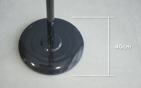 A base também é diferente aqui é basicamente um disco com 40 cm de diâmetro feito em plástico lustroso e uma peça que serve como peso para deixar o conjunto estável. Que por sinal é um pouco estranho nesse ventilador já que ele tende a ficar meio bambo, principalmente se o parafuso de baixo não estiver bem apertado.
