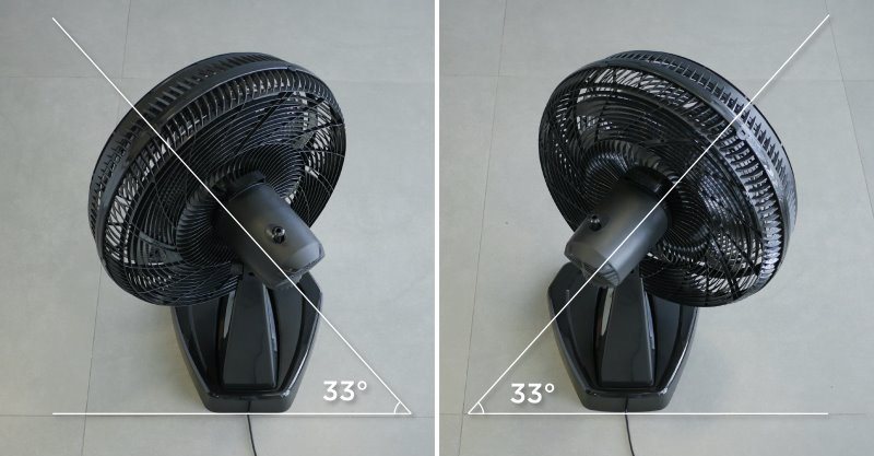O pescoço do ventilador possui um bom ângulo para frente, isso permite que ele possua um bom ajuste vertical principalmente para baixo, no de bancada esse ajuste é de cerca de 28° no modelo de coluna esse ajuste é um pouco mais limitado com 24°.