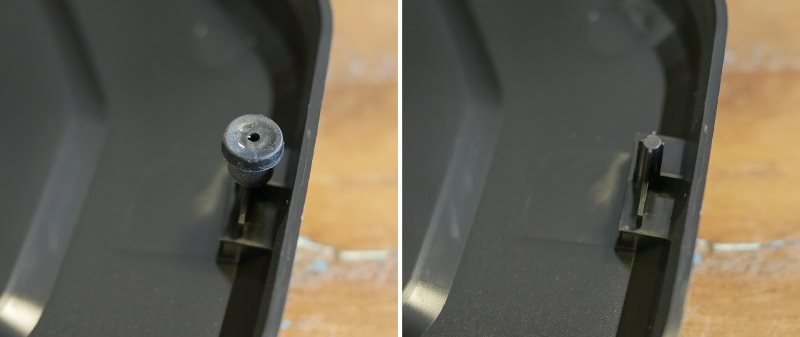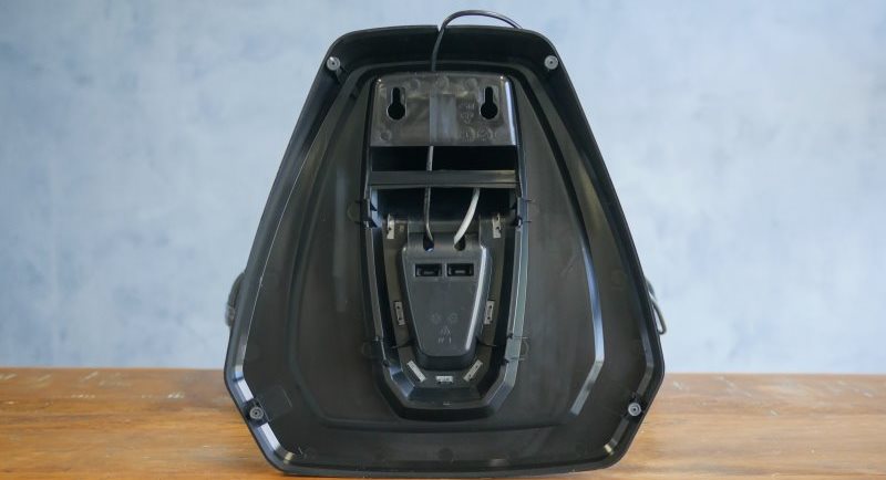 Na face inferior há 4 pezinhos de borracha que ficam presos em alguns pinos de plástico que são consideravelmente finos e podem quebrar com uma certa facilidade. Outro ponto presente em baixo da base são dois furos de encaixe para parafusos, esses servem para pendurar o conjunto na parede.