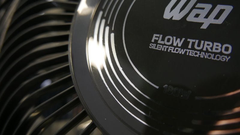 O Wap Flow Turbo é o ventilador com maior potência declarada já testado: 180W. Na prática, entretando, ele fica bem abaixo; praticamente estabilizando nos 111W. Se o motor for realmente projetado para 180W, faz com que ele possa ter uma vida útil melhor por trabalhar com um certa folga de potência.