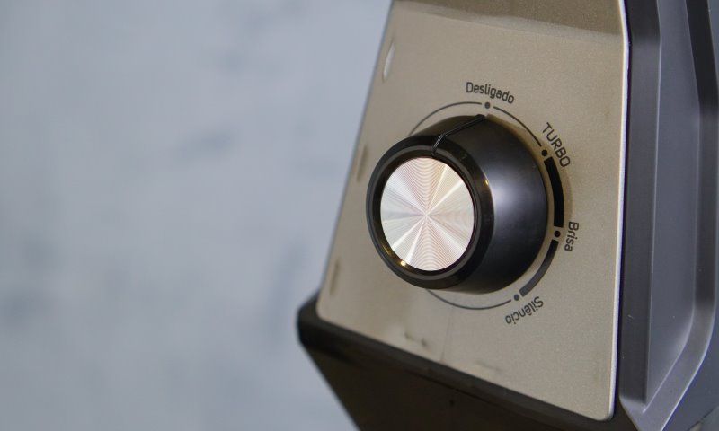 A haste do ventilador também possui um desenho quadrado com uma peças de acabamento na cor cinza e dá um detalhe agradável e facilita a visualização do seletor.